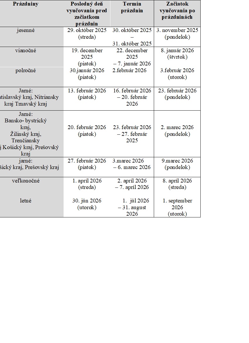 TERMÍNY ŠKOLSKÝCH PRÁZDNIN V ŠKOLSKOM ROKU 2025/2026