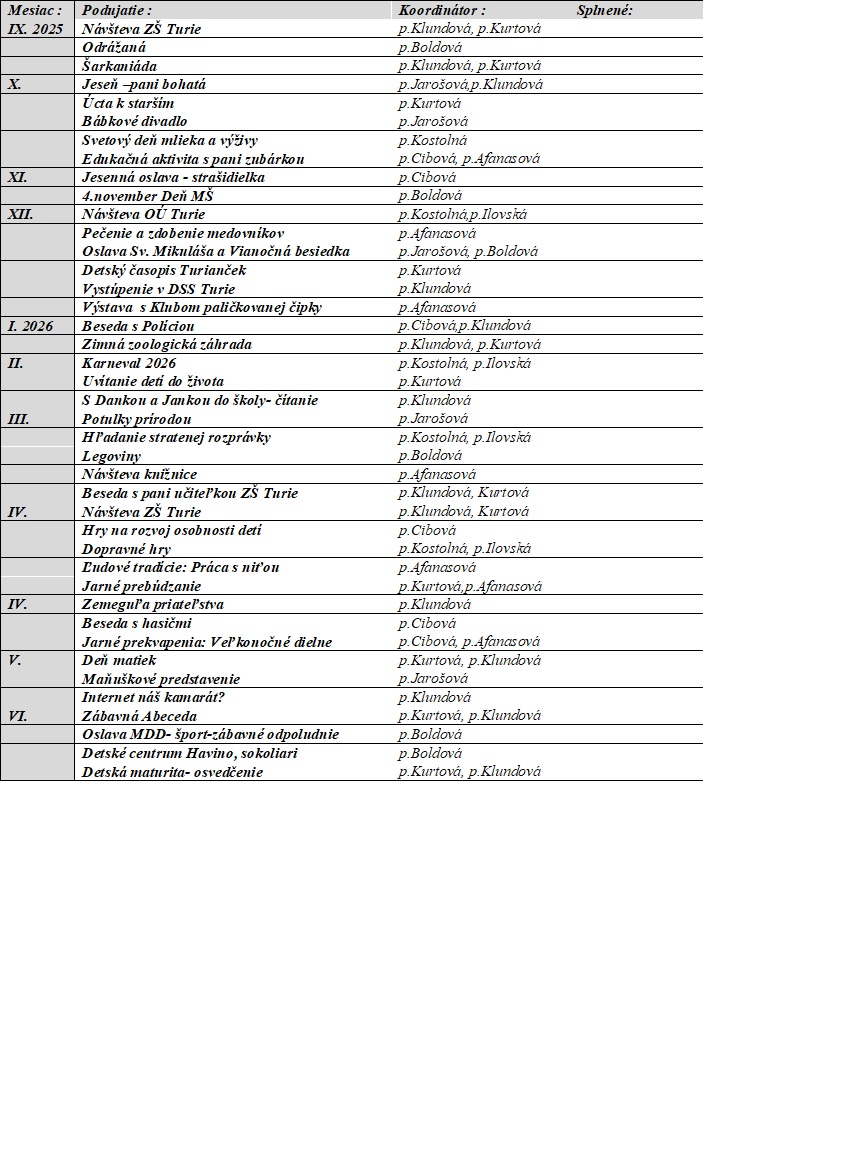 Kalendár podujatí MŠ Turie 2025/2026